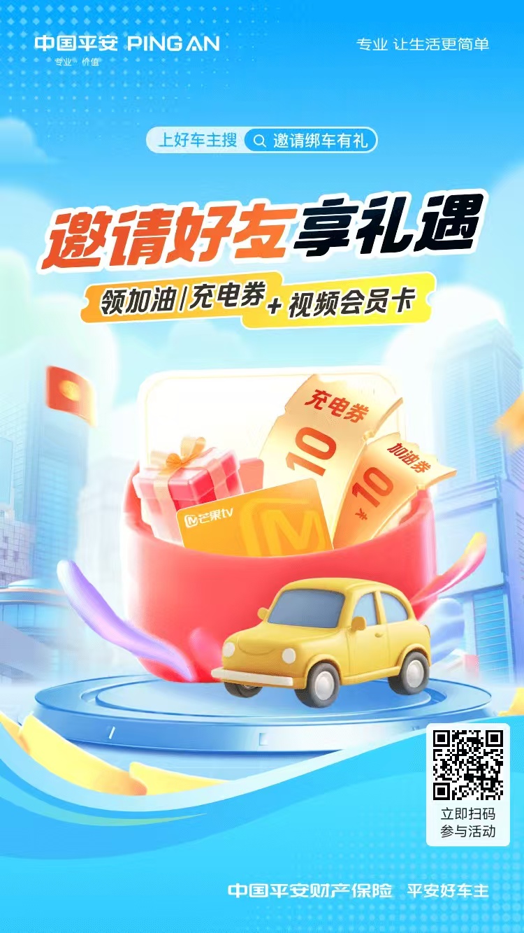 中国平安 | 上好车主搜邀请绑车有礼,邀请好友绑车,获加油券/充点券/芒果会员等好礼