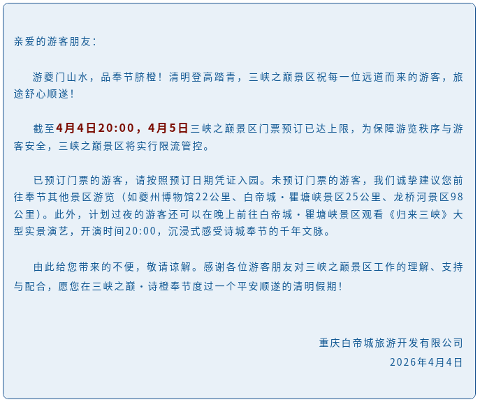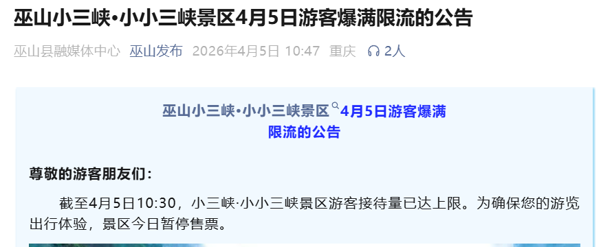 小三峡·小小三峡景区三峡之巅景区巫山三峡龙脊景区发布限流公告