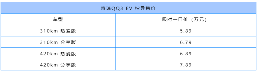 3月30日,奇瑞QQ3 EV正式迎来上市,新车共推出4款车型,限时一口价5.89-7.89万元。奇瑞QQ3 EV定位为纯电小型车,但是轴距达到2700mm,最大纯电续航420km,另外还配AI灵犀智舱、Carmind智能体以及猎鹰500智能驾驶辅助系统等。
