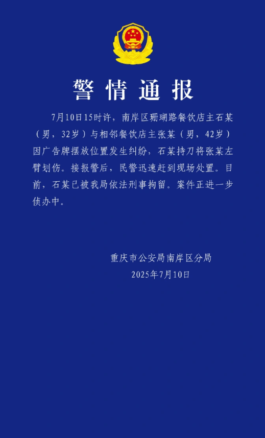 重庆市公安局南岸区分局通报,7月10日15时许,南岸区珊瑚路餐饮店主石某(男,32岁)与相邻餐饮店主张某(男,42岁)因广告牌摆放位置发生纠纷,石某持刀将张某左臂划伤。接报警后,民警迅速赶到现场处置。目前,石某已被依法刑事拘留。案件正进一步侦办中。