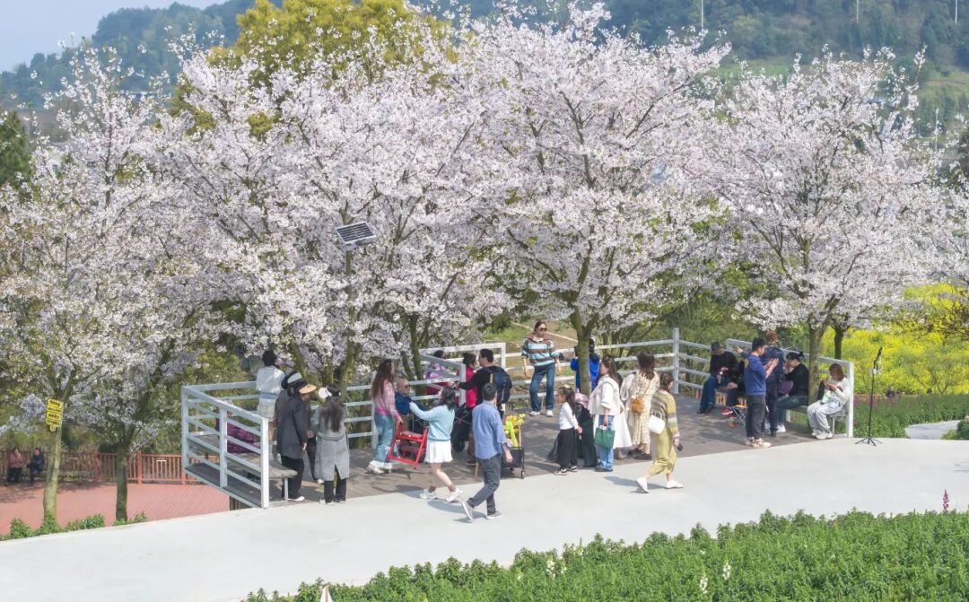 2025年3月23日,重庆巴南二圣镇天坪山,百亩樱花盛开,游客在樱花树下拍照打卡、游玩。