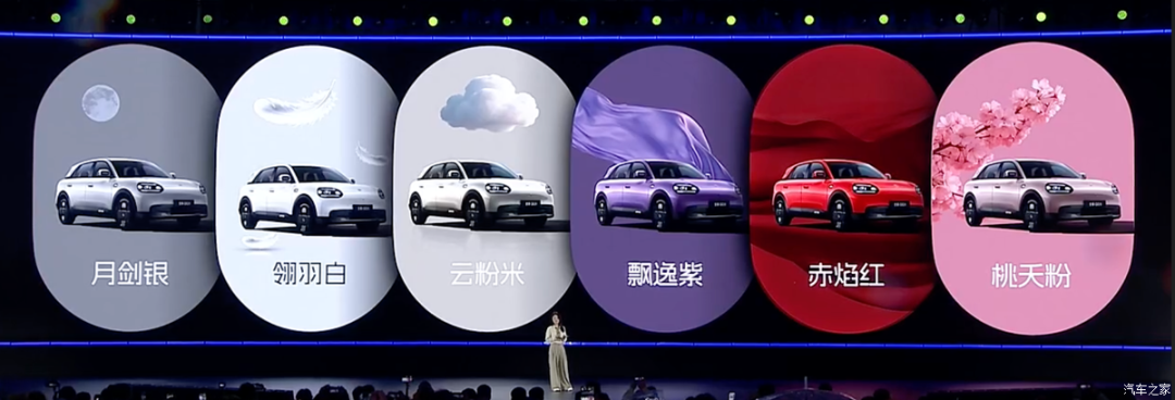 来看新车,其外观采用智圆行方的设计理念,封闭式前格栅搭配两侧圆润的Q型LED大灯,整车十分灵动可爱。格栅下方配备圆角贯穿式进气口,适当增加车辆运动感。车身颜色方面,其提供月剑银、翎羽白、云粉米、飘逸紫、赤焰红、桃夭粉共六种车身配色,另外还支持36色DIY车顶,满足个性化需求。
